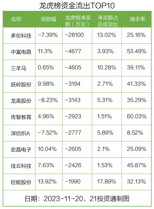 而龙虎榜中资金净流出最多的是多伦科技(603528.SH),被净卖出为2.81亿元,占总成交金额的13.02%。多伦科技收盘下跌7.39%,换手率为25.16%。