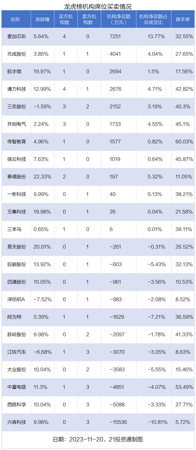 11月20日,23只个股龙虎榜出现了机构的身影,机构合计净卖出1.53亿元。具体来看,机构净买入12股,净卖出11股。
