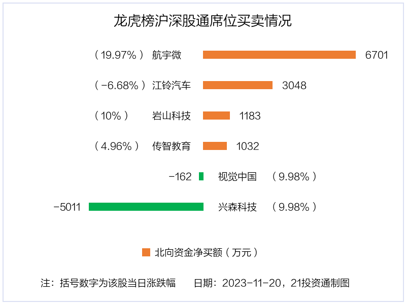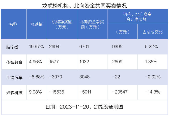 值得注意的是,机构和北向资金共同净买入了航宇微、传智教育等2股;共同净卖出了兴森科技;在江铃汽车上出现分歧,机构净卖出江铃汽车3070.03万元,北向资金净买入3047.69万元。