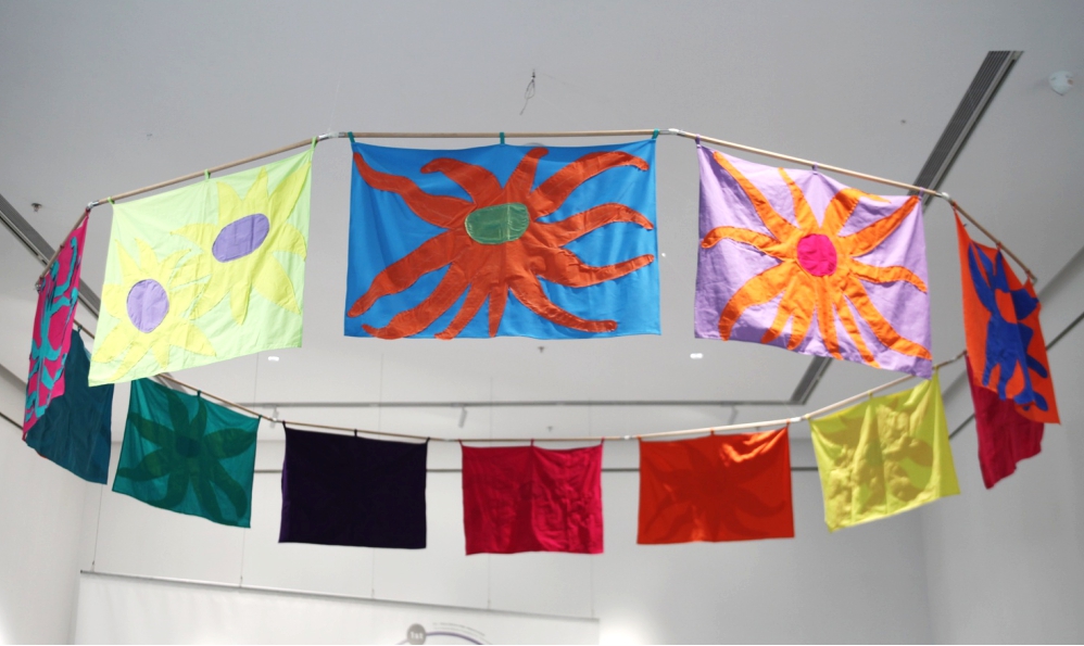 冯翰婷《娇娇的太阳》 布料,装置 单张尺寸:70 x 100 cm 装置尺寸:500 - 600 cm (直径)2023