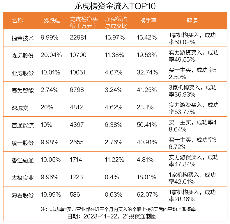 11月22日,上证指数下跌0.79%,深证成指下跌1.41%,创业板指下跌1.73%。盘后龙虎榜数据显示,共有43只个股因当日异动登上龙虎榜,资金净流入最多的是捷荣技术(002855.SZ),达2.3亿元。