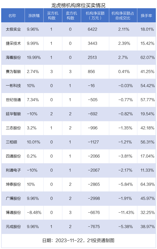 其中,机构净买入金额最多的是太极实业(600667.SH),当日收盘上涨9.96%,换手率为18.01%。