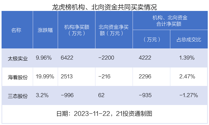 值得注意的是,机构和北向资金在三态股份,海看股份,太极实业上出现分歧,机构净卖出三态股份996.31万元,北向资金净买入61.69万元;机构净买入海看股份2512.59万元,北向资金净卖出216.11万元;机构净买入太极实业6421.86万元,北向资金净卖出2200.29万元。