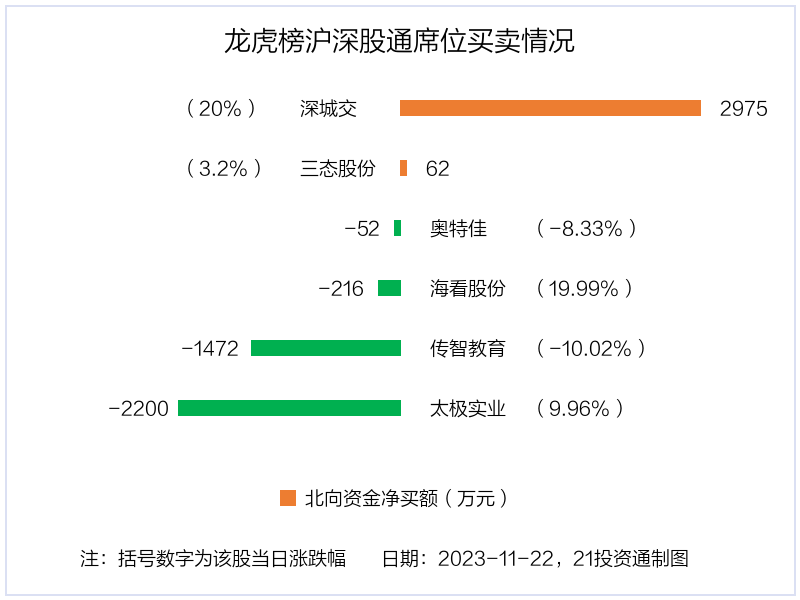 11月22日,北向资金参与龙虎榜中的个股共有6只,合计净卖出904.07万元。其中沪股通净卖出1 股,合计净卖出2200.29万元;深股通净买入2 股,净卖出3 股,合计净买入1296.22万元。