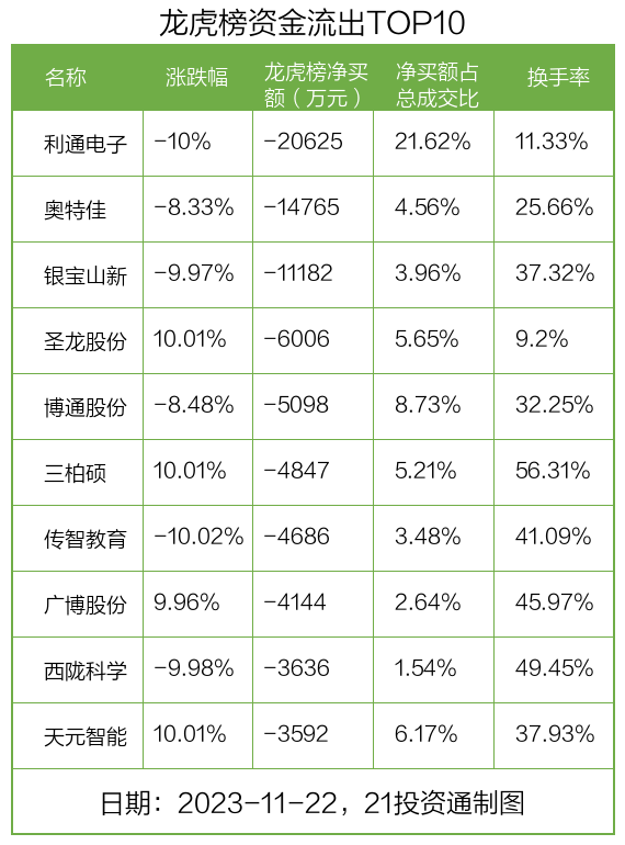 而龙虎榜中资金净流出最多的是利通电子(603629.SH),被净卖出为2.06亿元,占总成交金额的21.62%。利通电子收盘下跌10%,换手率为11.33%。