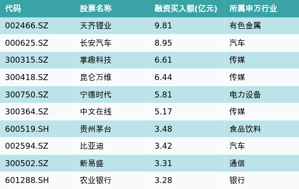 12月6日,两市共有3307只个股有融资资金买入,其中天齐锂业、长安汽车、掌趣科技排名前三,买入金额分别9.81亿元、8.95亿元、6.61亿元。融资买入额前10个股详情见下表: