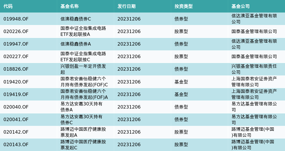 12月6日有11只新基金发行,分别为:信澳稳鑫债券C、国泰中证全指集成电路ETF发起联接A、信澳稳鑫债券A、国泰中证全指集成电路ETF发起联接C、兴银创盈一年定开债发起、国泰君安善怡稳健六个月持有债券发起(FOF)C、国泰君安善怡稳健六个月持有债券发起(FOF)A、易方达安嘉30天持有债券A、易方达安嘉30天持有债券C、路博迈中国医疗健康股票发起A、路博迈中国医疗健康股票发起C,详情见下表: