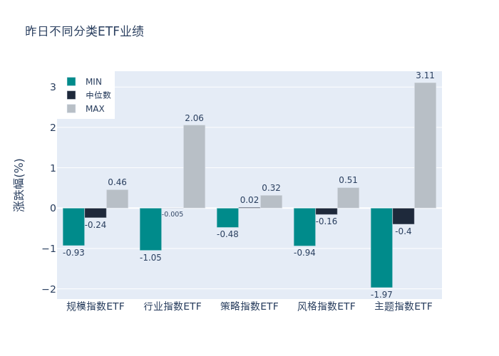 昨日股票型ETF收益率中位数为-0.25%。其中按照不同分类,规模指数中1000ETF增强收益率最高,为0.46%;行业指数中招商中证全指软件ETF收益率最高,为2.06%;策略指数中嘉实沪深300红利低波动ETF收益率最高,为0.32%;风格指数中国寿安保创精选88ETF收益率最高,为0.51%;主题指数中国泰中证影视主题ETF收益率最高,为3.11%。