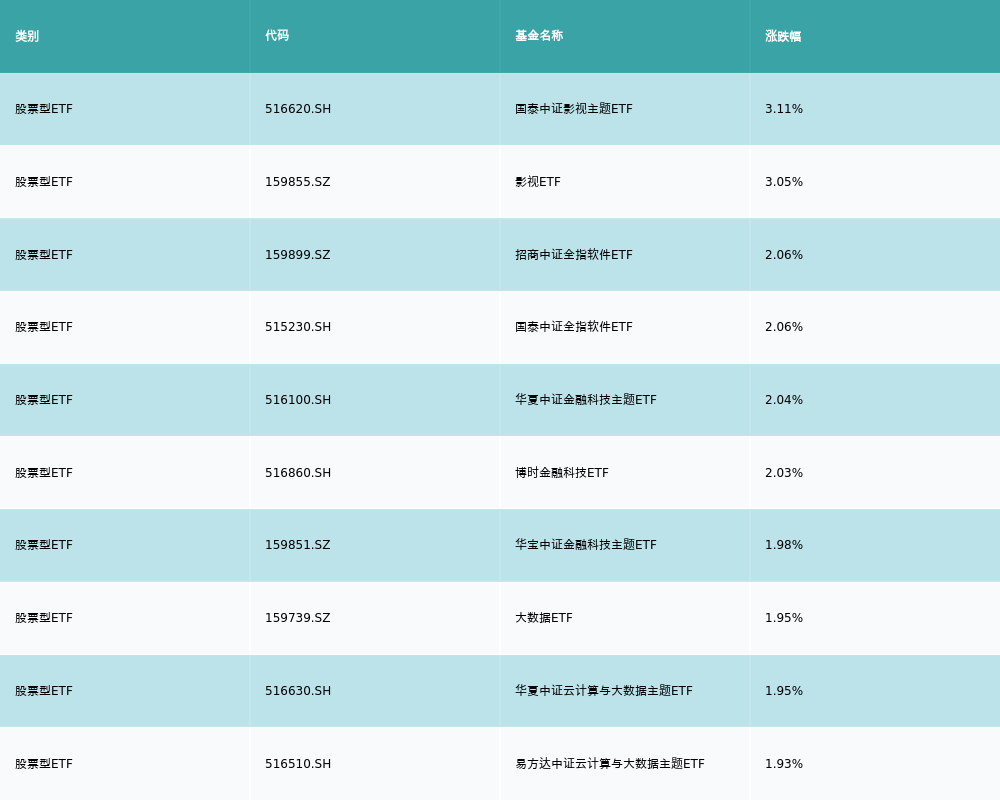 昨日股票型ETF涨幅最高的3支ETF及其收益率分别为:国泰中证影视主题ETF(3.11%)、影视ETF(3.05%)、招商中证全指软件ETF(2.06%)。涨幅前10详情见下表: