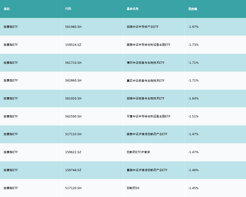 昨日股票型ETF跌幅最大的3支ETF及其收益率分别为:招商中证半导体产业ETF(-1.97%)、国泰中证半导体材料设备主题ETF(-1.73%)、博时中证疫苗与生物技术ETF(-1.71%)。跌幅前10详情见下表: