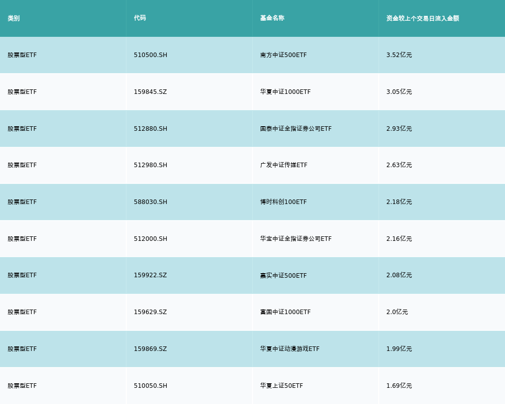 昨日股票型ETF资金流入最多的3支ETF及其流入金额分别为:南方中证500ETF(流入3.52亿元)、华夏中证1000ETF(流入3.05亿元)、国泰中证全指证券公司ETF(流入2.93亿元)。资金流入前10详情见下表: