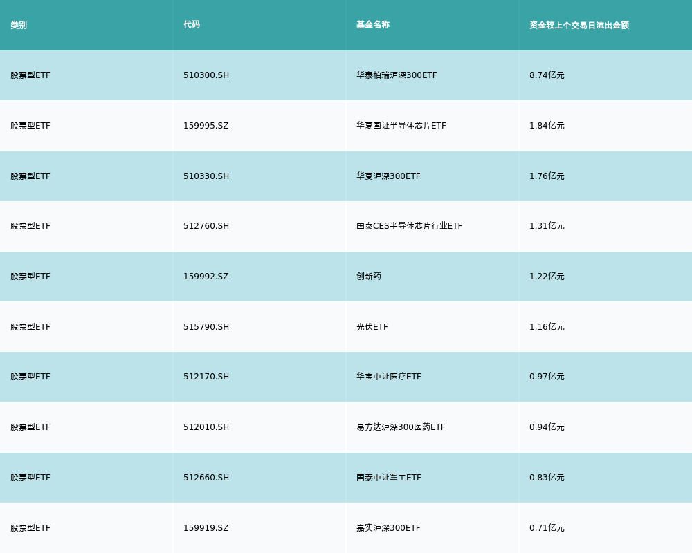 昨日股票型ETF资金流出最多的3支ETF及其流入金额分别为:华泰柏瑞沪深300ETF(流出8.74亿元)、华夏国证半导体芯片ETF(流出1.84亿元)、华夏沪深300ETF(流出1.76亿元)。资金流出前10详情见下表:
