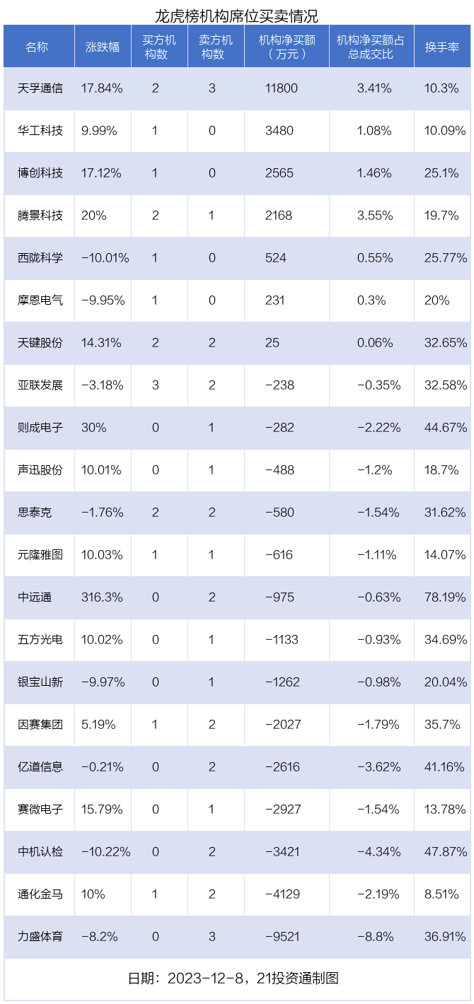 12月8日,21只个股龙虎榜出现了机构的身影,机构合计净卖出9419.99万元。具体来看,机构净买入7股,净卖出14股。