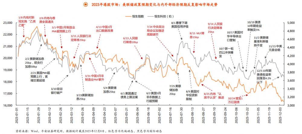 2023年港股市场受到美联储货币政策与内外部经济预期变化的影响而震荡下行,全年高股息策略表现占优,下半年随着美联储加息渐入尾声,恒生科技表现强于恒生指数。