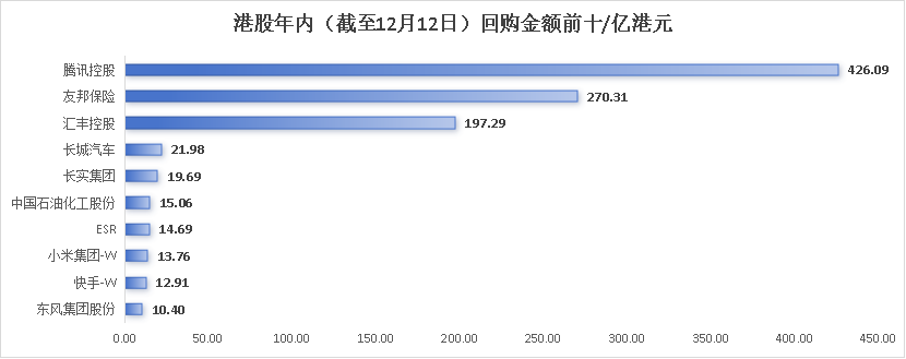 Wind数据显示,12月12日,共42只港股获公司回购,6只个股回购金额超千万港元。其中,腾讯控股回购金额最大,达4.02亿港元。Wind数据还显示,腾讯控股年内累计回购金额超过426亿港元,该金额已经超过了腾讯过去10年累计回购资金总额(2013年1月1日—2022年12月31日累计回购金额为401.51亿港元)。