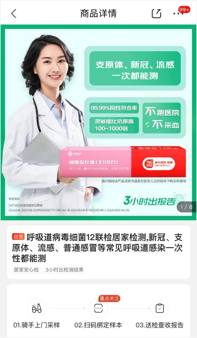 用户在线预约该服务后,将有专职骑手上门取样。用户按照说明书指引,完成口鼻拭子的采样后,把样本交给专职骑手,由骑手送至线下检测机构。一般来说,检测报告会在3小时内出具,并自动上传至京东APP。用户在收到短信提醒后,可在线查看检测结果,并了解相应的疾病科普知识,如有需求还可以通过“问医生”入口实时与医生沟通,获取专业的健康管理建议。