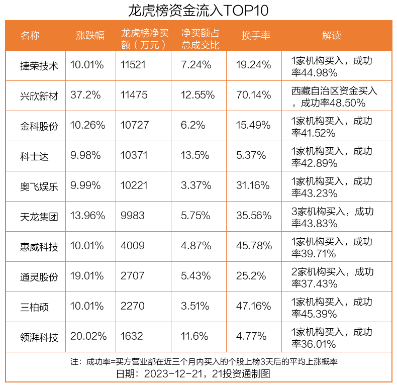 12月21日,上证指数上涨0.57%,深证成指上涨1.08%,创业板指上涨1.65%。盘后龙虎榜数据显示,共有38只个股因当日异动登上龙虎榜,资金净流入最多的是捷荣技术(002855.SZ),达1.15亿元。