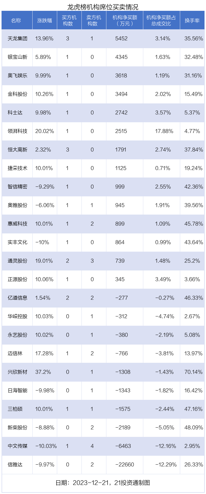 其中,机构净买入金额最多的是天龙集团(300063.SZ),当日收盘上涨13.96%,换手率为35.56%。