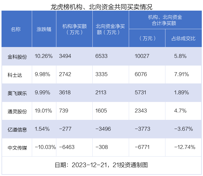 值得注意的是,机构和北向资金共同净买入了金科股份、科士达、奥飞娱乐、通灵股份等4股;共同净卖出了中文传媒、亿道信息等2股。