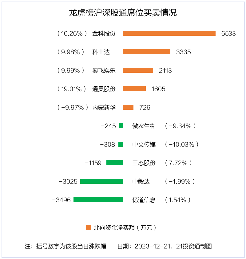 12月21日,北向资金参与龙虎榜中的个股共有10只,合计净买入6077.64万元。其中沪股通净买入1 股,净卖出3 股,合计净卖出2852.64万元;深股通净买入4 股,净卖出2 股,合计净买入8930.28万元。