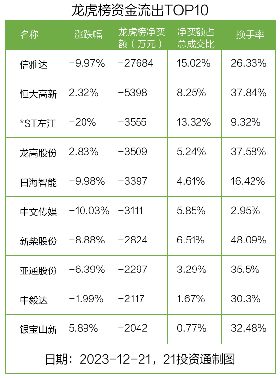 而龙虎榜中资金净流出最多的是信雅达(600571.SH),被净卖出为2.77亿元,占总成交金额的15.02%。信雅达收盘下跌9.97%,换手率为26.33%。