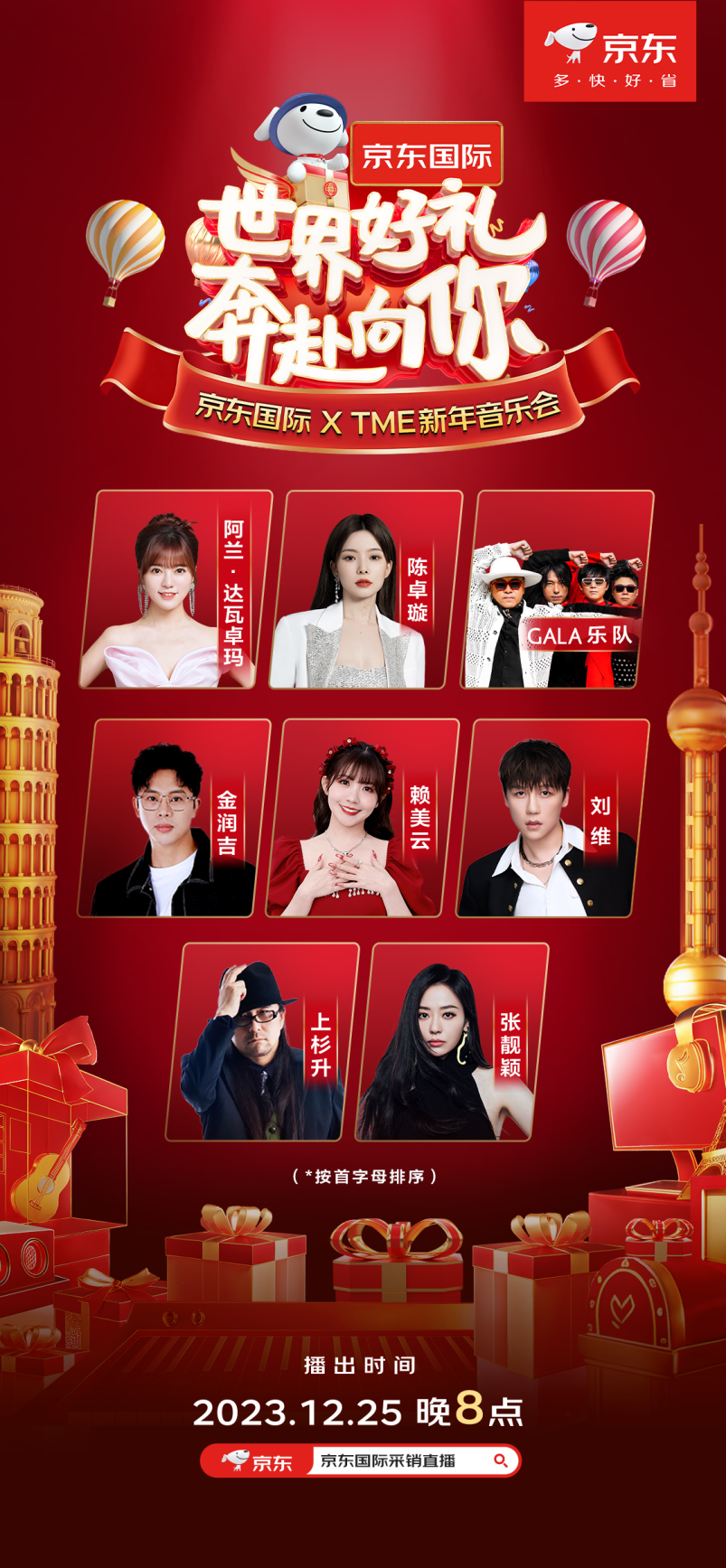 12月25日晚8点,由京东国际与腾讯音乐娱乐集团(以下简称“TME”)联袂打造的“世界好礼,奔赴向你”新年音乐会将准时开唱,阿兰、陈卓璇、GALA乐队、金润吉、赖美云、刘维、上杉升、张靓颖(*按首字母排序)等知名音乐人,将演唱十三首中外经典歌曲,用音乐唤起心中美好记忆。