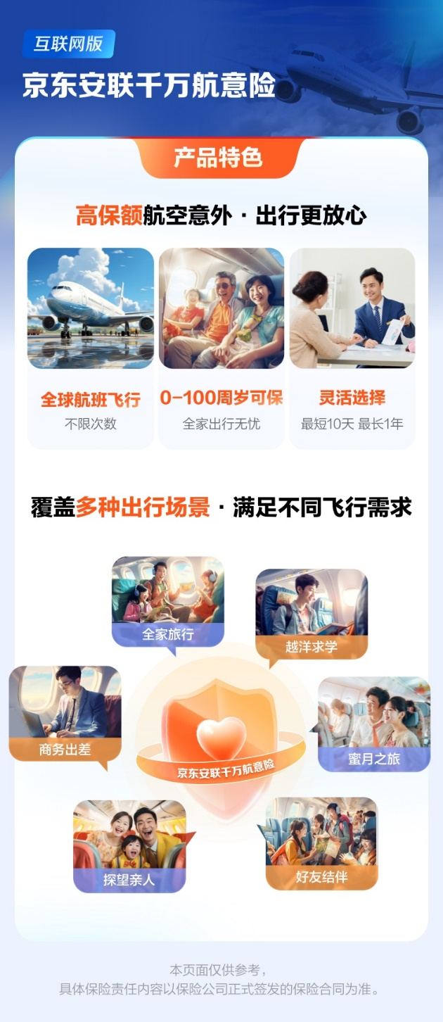 12月28日,京东保全新上线一款高性价比的航意险——千万航意险(互联网版),最低10元保费(保险期间10天)可获得高达1000万元的高额航意保障,性价比在同类产品中属前列,客户打开京东APP搜索“京东保”进入展示首页,即可投保。该产品由京东安联财险承保,保障期限包含10天、30天、1年三种方案可选,投保人可以自行选择保险生效日,不限飞行次数,出生满30天-100周岁均可投保。无论是商务出差、全家旅行还是越洋求学、蜜月之旅,保障覆盖全球航班,无论什么出行场景,用户均可便捷丝滑投保。