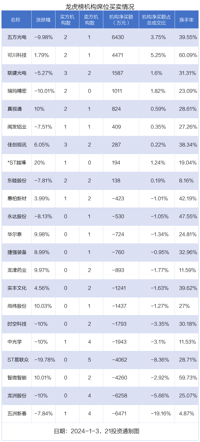 1月3日,22只个股龙虎榜出现了机构的身影,机构合计净卖出1.54亿元。具体来看,机构净买入9股,净卖出13股。