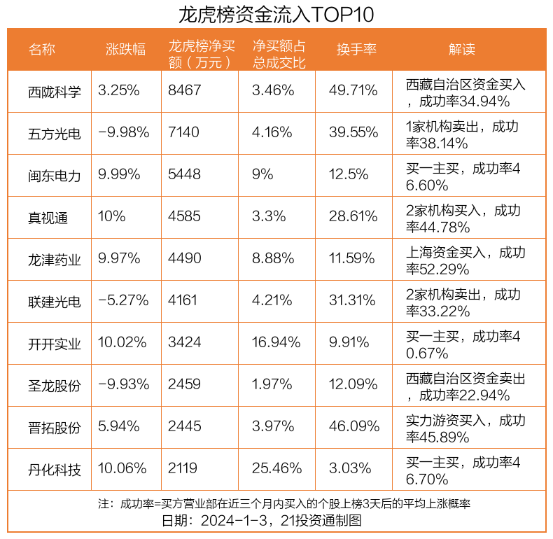 1月3日,上证指数上涨0.17%,深证成指下跌0.75%,创业板指下跌1.14%。盘后龙虎榜数据显示,共有46只个股因当日异动登上龙虎榜,资金净流入最多的是西陇科学(002584.SZ),达0.85亿元。