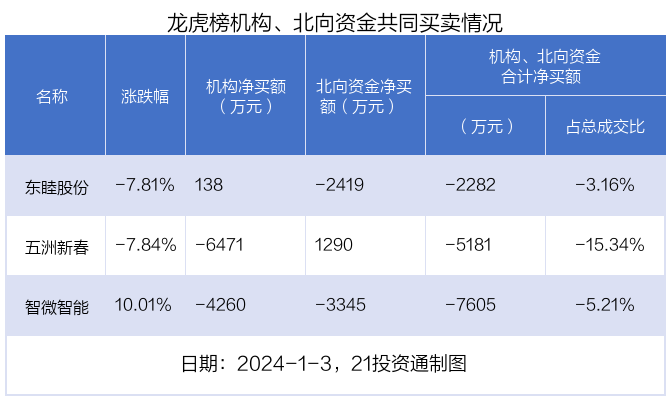 值得注意的是,机构和北向资金共同净卖出了智微智能;在五洲新春,东睦股份上出现分歧,机构净卖出五洲新春6470.88万元,北向资金净买入1290.05万元;机构净买入东睦股份137.53万元,北向资金净卖出2419.44万元。