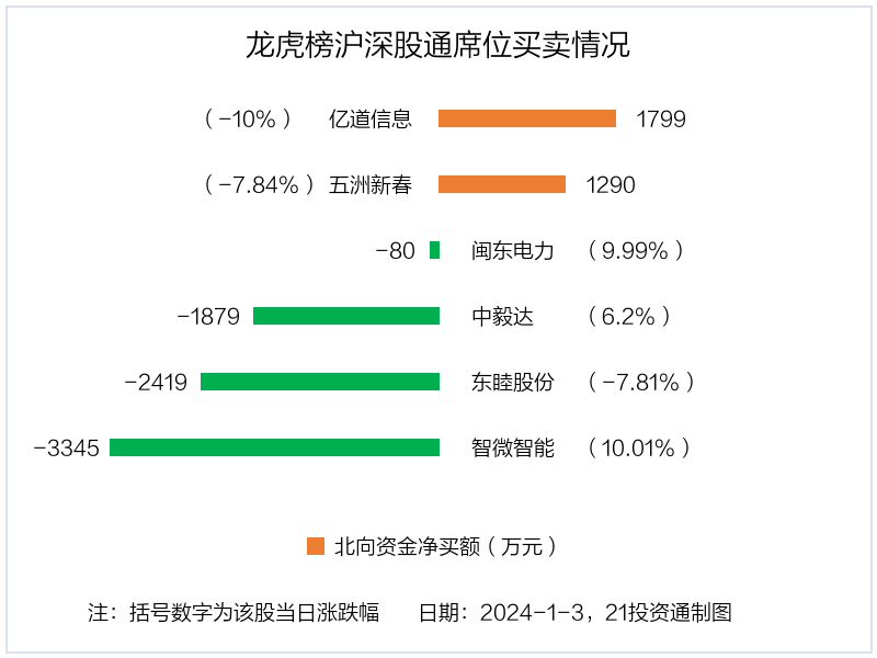 1月3日,北向资金参与龙虎榜中的个股共有6只,合计净卖出4634.39万元。其中沪股通净买入1 股,净卖出2 股,合计净卖出3008.25万元;深股通净买入1 股,净卖出2 股,合计净卖出1626.14万元。