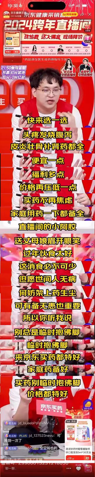 虽然走进直播间的时间还不长,但采销们创新的尝试层出不穷。比如在今年的跨年直播中,来自京东健康医药部的采销就在直播间“露了一手”。这位采销把复杂难记的药品名称编成了一段即兴rap,把健康常备演绎得朗朗上口。