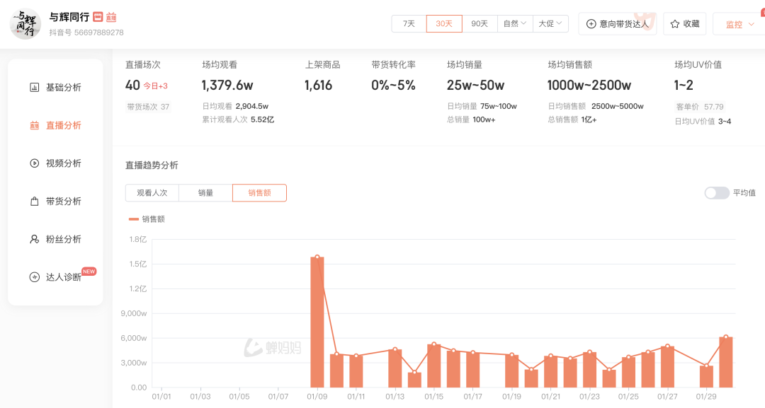 蝉妈妈的数据显示,与辉同行单场直播GMV已经从一开始的1.6亿元,逐步回落至四五千万元左右,而东方甄选单场GMV并没有太大波动。两个直播间场观人数、转化率等较为接近。