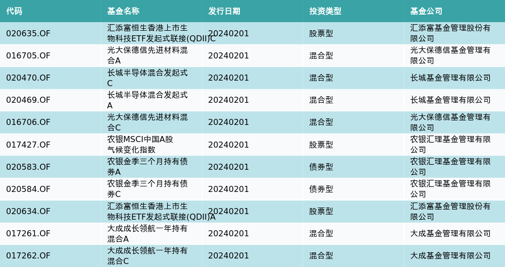 2月1日有11只新基金发行,分别为:汇添富恒生香港上市生物科技ETF发起式联接(QDII)C、光大保德信先进材料混合A、长城半导体混合发起式C、长城半导体混合发起式A、光大保德信先进材料混合C、农银MSCI中国A股气候变化指数、农银金季三个月持有债券A、农银金季三个月持有债券C、汇添富恒生香港上市生物科技ETF发起式联接(QDII)A、大成成长领航一年持有混合A、大成成长领航一年持有混合C,详情见下表: