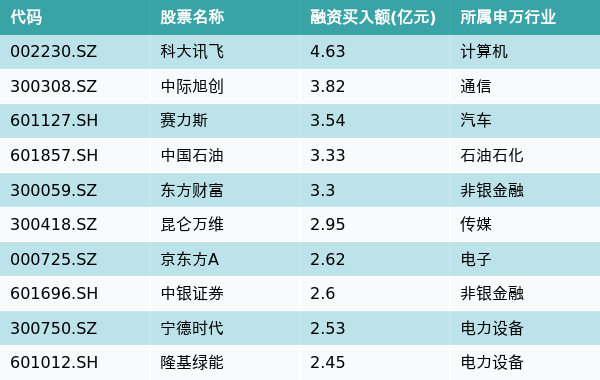 2月1日,两市共有3330只个股有融资资金买入,其中科大讯飞、中际旭创、赛力斯排名前三,买入金额分别4.63亿元、3.82亿元、3.54亿元。融资买入额前10个股详情见下表: