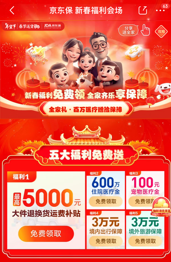 除此之外,京东保还将在2月6日-2月24日整个龙年春节期间,推出“京东保春晚福利会场”,为广大用户提供"爱宠礼·宠物医疗保障赠险”、“全家礼·百万健康医疗保障赠险”、“购物礼·最高五千元大件运费补贴”、“出行礼·境内外旅行保障赠险”、“生活礼·十大超值专属权益” 这五大新春保障福利,用户只需要在京东APP搜索关键词“领保障”一键直达活动会场,即可领取这些京东保为大家提供的保障福利,不仅可以送自己、送长辈、送孩子、送宠物,还可以安心开启境内或境外的自由行。