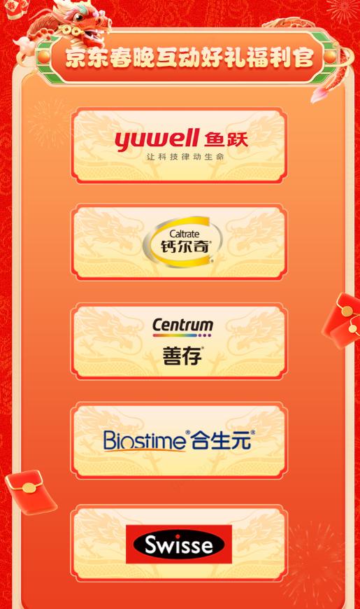 2024龙年春节近在眼前,全球华人对春晚的期待值也越来越高。2月6日,京东正式公布了1亿份实物好礼清单和互动攻略,其中就包括了鱼跃语音血压计、金钙尔奇钙片、善存复合维生素、合生元益生菌粉、Swisse维生素C泡腾片等在内的30多款健康好礼。届时,观众朋友们只需登录京东APP参与互动,即有机会一分钱带走包括上述奖品在内的实物好礼,共襄这场惊喜不断的“春节大奖盛宴”。