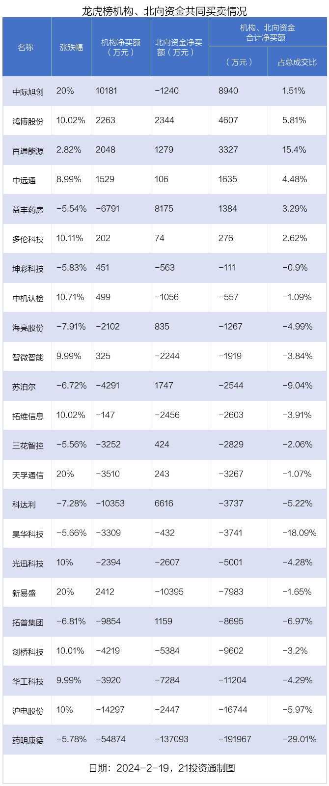 值得注意的是,机构和北向资金共同净买入了鸿博股份、百通能源、中远通、多伦科技等4股;共同净卖出了昊华科技、沪电股份、拓维信息、光迅科技、剑桥科技、华工科技、药明康德等7股;在益丰药房、科达利、苏泊尔、拓普集团、海亮股份、三花智控、天孚通信、坤彩科技、中机认检、中际旭创、智微智能、新易盛上出现分歧,机构净卖出益丰药房6791.18万元,北向资金净买入8174.73万元;机构净卖出科达利1.04亿元,北向资金净买入6615.83万元;机构净卖出苏泊尔4291.45万元,北向资金净买入1747.45万元;机构净卖出拓普集团9854.27万元,北向资金净买入1158.91万元;机构净卖出海亮股份2102.01万元,北向资金净买入835.36万元;机构净卖出三花智控3252.34万元,北向资金净买入423.8万元;机构净卖出天孚通信3510.11万元,北向资金净买入243.17万元;机构净买入坤彩科技451.49万元,北向资金净卖出562.67万元;机构净买入中机认检499.33万元,北向资金净卖出1056.4万元;机构净买入中际旭创1.02亿元,北向资金净卖出1240.29万元;机构净买入智微智能325.09万元,北向资金净卖出2244.19万元;机构净买入新易盛2411.86万元,北向资金净卖出1.04亿元。