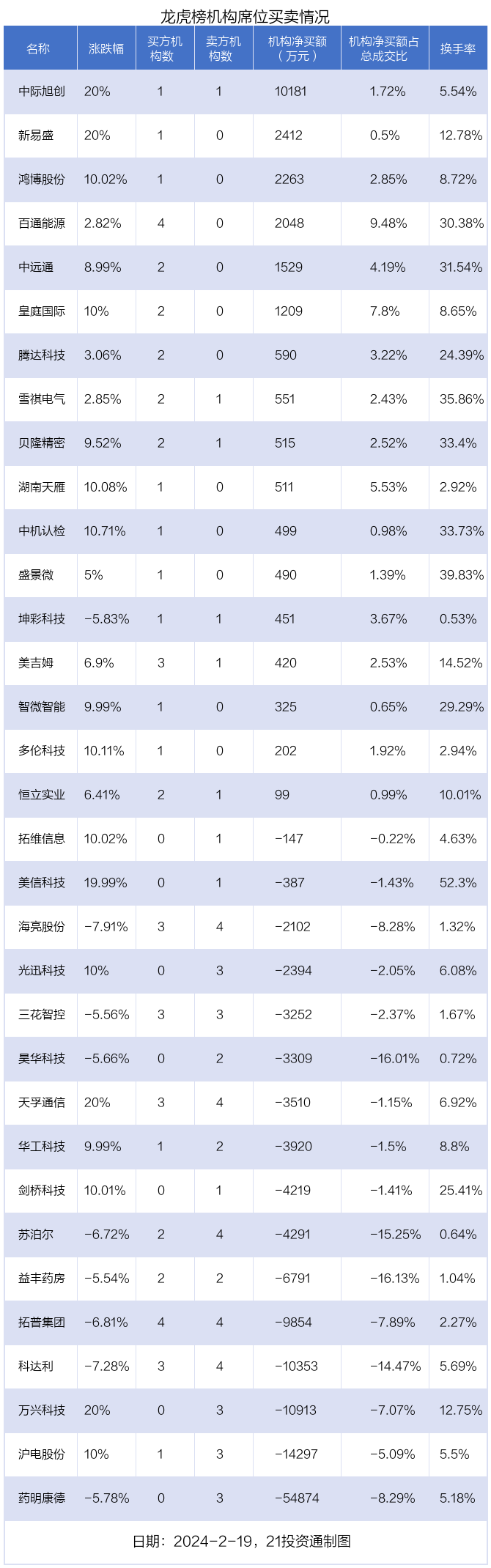 2月19日,33只个股龙虎榜出现了机构的身影,机构合计净卖出11.03亿元。具体来看,机构净买入17股,净卖出16股。