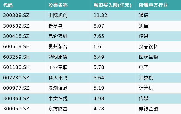 2月20日,两市共有3332只个股有融资资金买入,其中中际旭创、新易盛、昆仑万维排名前三,买入金额分别11.32亿元、8.07亿元、7.65亿元。融资买入额前10个股详情见下表: