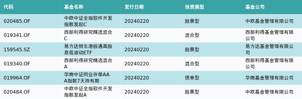 2月20日有6只新基金发行,分别为:中欧中证全指软件开发指数发起C、西部利得研究精选混合C、易方达恒生港股通高股息低波动ETF、西部利得研究精选混合A、华商中证同业存单AAA指数7天持有期、中欧中证全指软件开发指数发起A,详情见下表: