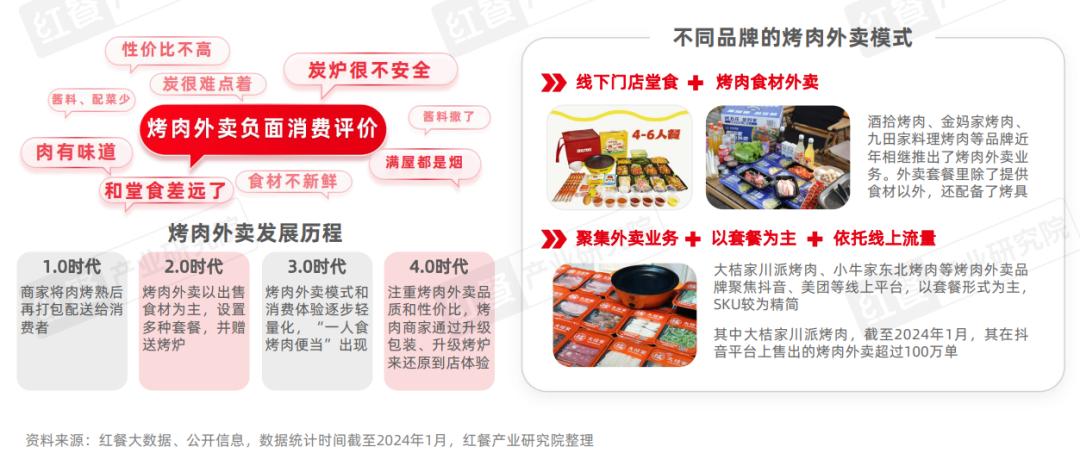 除了场景创新以外,目前有部分烤肉品牌积极探索烤肉外卖业务。尽管烤肉外卖已经从1.0时代升级到3.0时代,但在消费者心目中,烤肉外卖在食材、安全、包装等方面仍有待提升的地方。