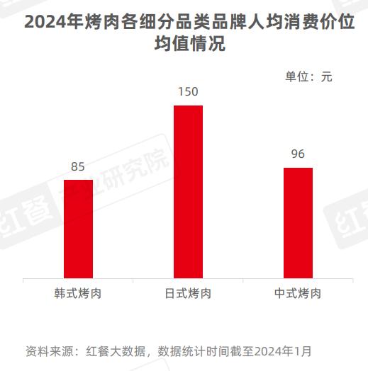 值得注意的是,烤肉品类的三大细分赛道人均消费价位各不相同。日式烤肉整体人均消费相对较高,在高端烤肉市场占主导地位。而韩式烤肉品牌大多走亲民、高性价比路线,人均消费价位在85元左右,中式烤肉则介于二者之间。