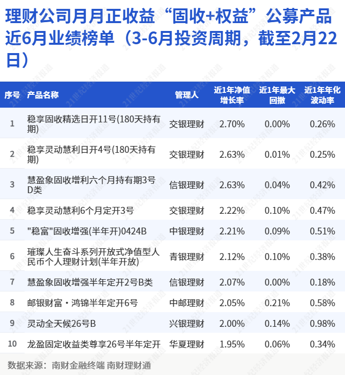 榜单筛选条件:理财公司发行的投资周期在3-6月(含)的公募“固收+权益”产品,且近6月每个完整的自然月度月末均为正收益的产品,同系列同投资周期产品保留一只。