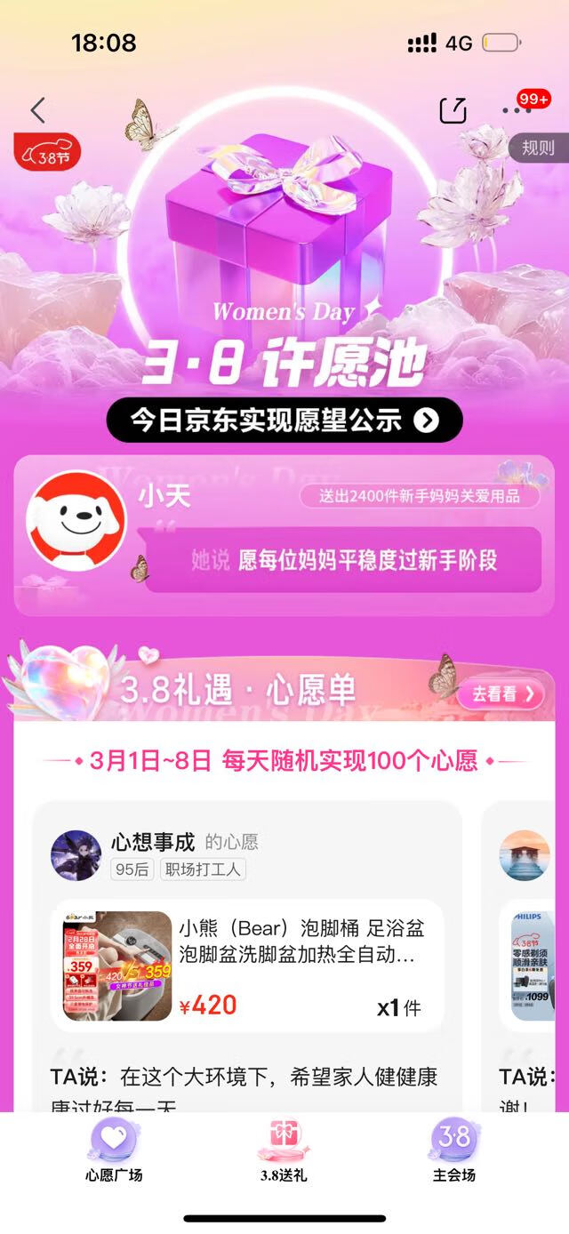 3·8国际劳动妇女节即将来临。近日,京东上线“京东3·8许愿池”,活动期间,用户可以来京东站内许下礼物心愿,也可以助力“她”实现心愿。值得关注的是,有网友发现,在活动页面一位名为“小天”的用户率先下单,满足了中国妇女报的一名记者的心愿,为300名新手妈妈们送出关爱包,其中包含妈咪包、湿巾、乳霜纸、防溢乳垫、蒸汽眼罩、维生素D、孕产妇保温杯……等2400件商品。不少网友猜测,这位“小天”是否就是章泽天本人。经京东内部人士证实,该名用户就是京东公益基金会荣誉理事长章泽天女士,这些关爱包将会通过北京缘梦公益基金会发放给新手妈妈们,用以支持“还新手妈妈一夜安睡”项目,帮助妈妈们平稳度过新手阶段。
