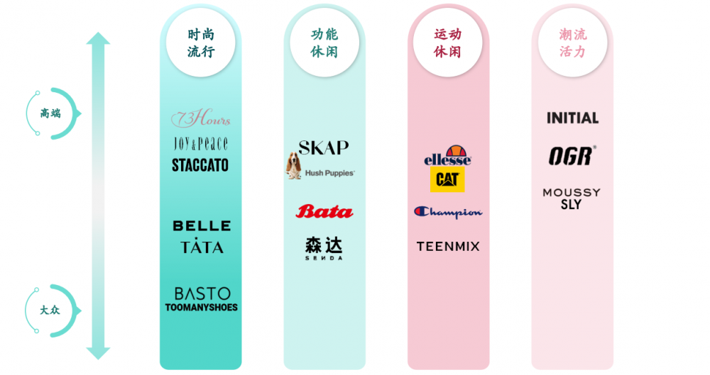 招股书显示,百丽时尚已布局19个核心品牌的多元化组合,覆盖女鞋、男鞋、童鞋、服装和配饰等品类,包括定位于时尚流行的BELLE、TATA、STACCATO、73Hours、Joy&Peace、BASTO、TooManyShoes,功能休闲的SKAP、hush puppies、Bata、SENDA,运动休闲的TEENMIX、CHAMPION、CAT、ellesse,潮流活力的OGR、INITIAL、MOUSSY、SLY,满足不同年龄、不同场合的多元需求。