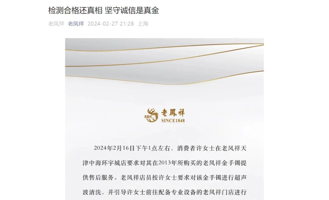 27日,老凤祥在官微发文:经过第三方机构检测,该手镯质量合格。双方达成和解。