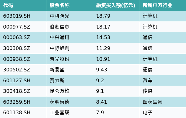 3月4日,两市共有3335只个股有融资资金买入,其中中科曙光、浪潮信息、中兴通讯排名前三,买入金额分别18.79亿元、18.17亿元、14.53亿元。融资买入额前10个股详情见下表: