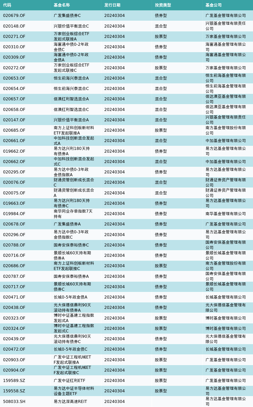 3月4日有38只新基金发行,分别为:广发集盛债券C、兴银价值平衡混合C、万家创业板综合ETF发起式联接A、海富通中债0-2年政金债C、海富通中债0-2年政金债A、万家创业板综合ETF发起式联接C、恒生前海兴泰混合A、恒生前海兴泰混合C、信澳红利智选混合A、信澳红利智选混合C、兴银价值平衡混合A、南方上证科创板新材料ETF发起联接A、中加科技创新混合发起式A、易方达兴利180天持有债券A、中加科技创新混合发起式C、易方达中债0-3年政金债指数A、财通资管创新成长混合C、财通资管创新成长混合A、易方达兴利180天持有债券C、南华同业存单指数7天持有、广发集盛债券A、易方达中债0-3年政金债指数C、国寿安保泰裕债券C、景顺长城60天持有期债券A、南方上证科创板新材料ETF发起联接C、国寿安保泰裕债券A、景顺长城60天持有期债券C、长城0-5年政金债A、光大保德信鼎利90天滚动持有债券A、博时中证基建工程指数发起式A、博时中证基建工程指数发起式C、光大保德信鼎利90天滚动持有债券C、长城0-5年政金债C、广发中证工程机械ETF发起式联接A、广发中证工程机械ETF发起式联接C、广发中证红利ETF、易方达中证半导体材料设备主题ETF、易方达深高速REIT,详情见下表: