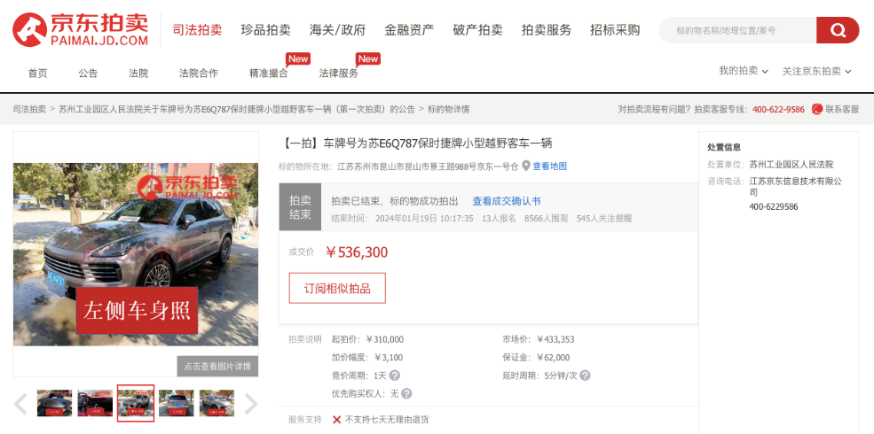 对于期待通过购买不动产实现收益的投资人来说,司法拍卖提供了一个具备价格优势、且一定程度上可规避潜在风险的投资渠道。本次法拍节上拍的众多拍品中,成交金额最高的是位于苏州市吴中区甪直镇甪直大道38号的一处面积18820.3平方米工业用地,最终以8840万元的价格成交。而车牌号为苏E6Q787的保时捷牌小型越野客车则成为了围观人数最多、提醒人数最多的拍品,其成交价为53.63万元,围观人数达8566人,充分展现出超值法拍车的抢手程度。
